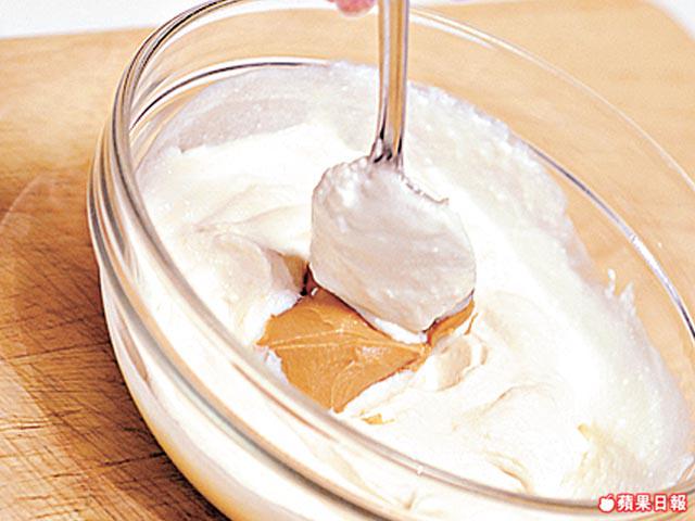 1.先做花生味,將半份希臘乳酪、2湯匙蜂蜜及花生醬拌勻,倒入杯中,面撒花生碎及薄荷葉作裝飾即可。
