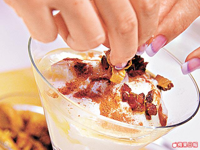 2.然後做乾果款式,將剩餘的乳酪倒入杯,淋上剩餘蜂蜜及檸檬汁,撒上肉桂粉,再加已切粒的無花果乾及杏桃乾即成。