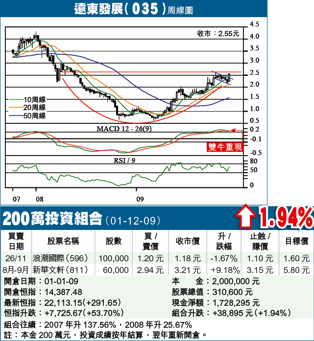 遠展8月由1.80元水平反覆上升,至10月中高見2.62元,大升45%,最近個半月以小型下降通道整固,最近兩日以大陽燭升破通道頂阻力,日線圖MACD重現雙牛買入訊號,RSI升破下降軌,前高位2.62元一旦衝破,股價即望空衝刺,直指3.14元短期目標。