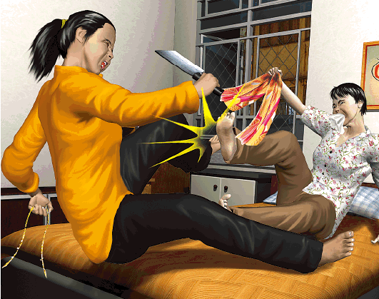 至昨凌晨約2時,熟睡中的鄧婆婆感到雙腳劇痛,身體動彈不得掙扎驚醒,漆黑中只見一名口鼻蒙上絲巾持刀女賊用雙膝跪在她腳上,並拚命強搶其頸上一両多重、連兩個吊墜的金頸鏈,她死命掙扎大叫,女賊立刻用手掩其嘴,企圖令她不能叫喊。