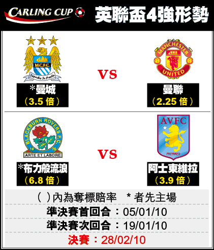 這是自03年以來首次出現英聯盃無倫敦球隊殺入4強,衞冕的曼聯與曼城頓成奪標首、次熱門。另一準決賽戲碼為布力般流浪對阿士東維拉,賽事於明年1月進行兩回合激戰。