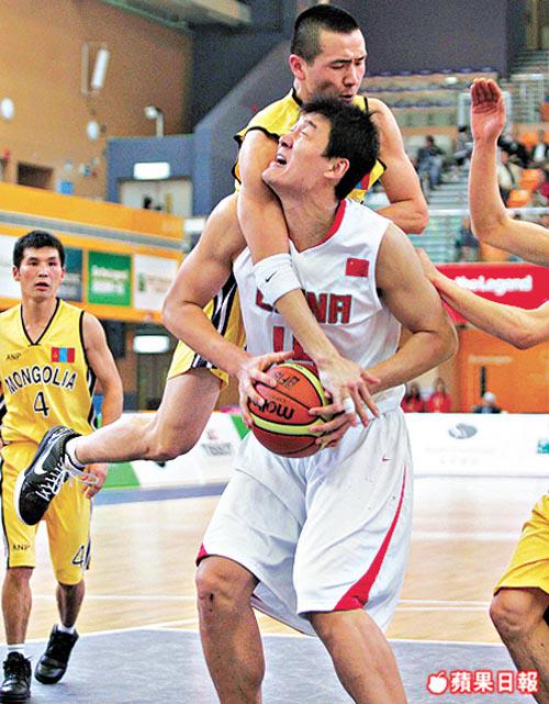 中國男籃昨出戰首場東亞運初賽,面對打法粗野的蒙古;中鋒蘇偉(持球者)被蒙古球員(上)飛擒在身上爭波的情形屢見不鮮;最終蒙古全場有5名球員5犯離場,並以77:111不敵中國。鄧永賢攝