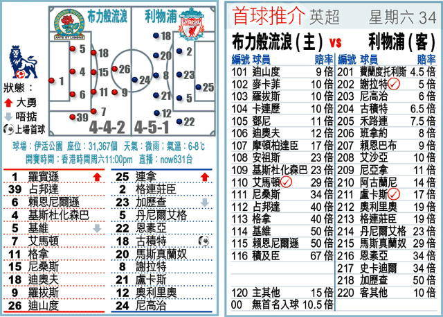 再者,布力般續缺中場主力鄧尼,就算有前鋒迪山度復出,而領隊艾拿迪斯動過心臟手術後終可以再次復出領軍,面對再次有勢的利物浦,布力般實在不宜高估。