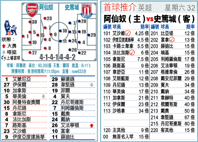 聯賽連敗兼在英聯盃出局的阿仙奴,周六英超主場出擊,面對硬朗的史篤城。以近季往績,以柔制剛的阿仙奴似能剋制史篤城,信兵工廠及時反底,博「主勝」。(球賽編號:星期六32;now633台今日11:00pm直播)