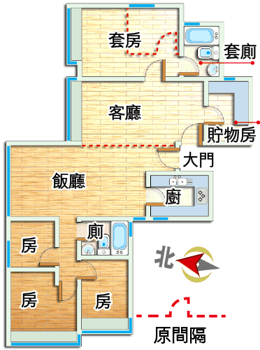 客廳旁原圖則兩房打通,收納浴室,自製大碼套房,形成4房連套房格局。客廳旁原圖則廚房改作貯物室,令間隔更好用。