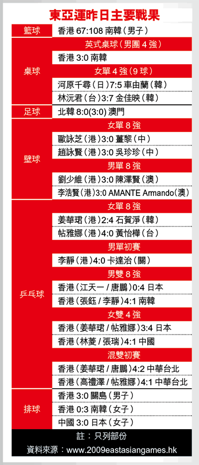 香港壁球隊在今日東亞運開幕前,已為香港穩奪6面獎牌(4面男、女單打及兩面男、女雙),港隊中世界排名最高(第16)的歐詠芝,今日將移師香港公園室內場的四面玻璃場出戰女單4強,她表示昨仗後更有信心爭取金牌。