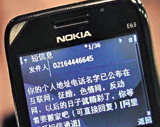 另一重慶網民所受的滋擾更大,女網民陳蓉上周三凌晨3時收到短信,聲稱她的電話、地址已在網上公佈,徵婚網、色情網、反動網等都有,「以後日子就精采了,你等着搬家吧!」(圖)之後,她的手機響個不停,電話另一頭是一名聲音沙啞男子低沉的奸笑。該男子平均每日打陳蓉手機上百次。她雖然向派出所報案,但公安卻稱因為對方不構成威脅、恐嚇,沒有立案。