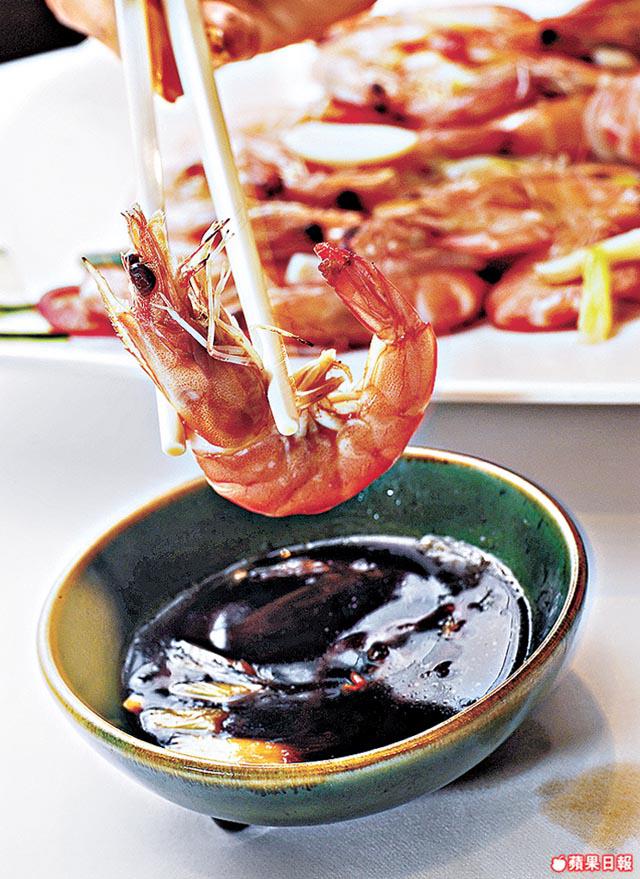 用玫瑰露浸蝦兩次,煮時起火令酒味更芳香,蝦肉深層和蝦膏都有酒味。