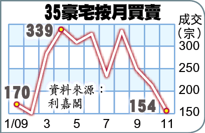 【本報訊】今年表現一直跑贏大市的豪宅市場,踏入第4季成交量終見調整,利嘉閣研究部統計35個豪宅屋苑,11月成交量較10月跌27.7%,只得154宗成交。該行估計,樓市調整已近尾聲,本月豪宅交投會回升至200宗以上。