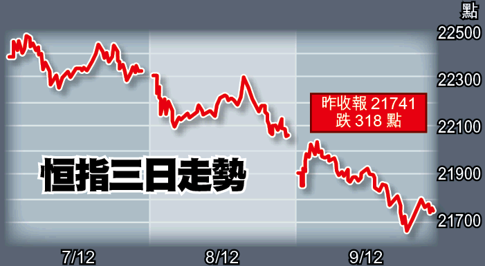 杜拜世界與債權銀行就重組的商討未有結果,旗下子公司棕櫚島上半年更錄得巨額虧損,加上希臘信貸評級突然被調低,投資者對危機憂慮加深,環球股市下跌。恒指昨跟隨外圍弱勢低開154點,午後跌勢加劇,最多跌402點,收21741點,跌318點或1.44%,成交額750億元。