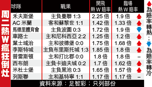英足盃方面,熱至1.17倍的列斯聯W同樣泡湯,法定時間內與非聯賽球隊基特寧打成1:1,到加時才狂入4球,最終贏5:1晉級,激死熱W客。文:戰鬥員A