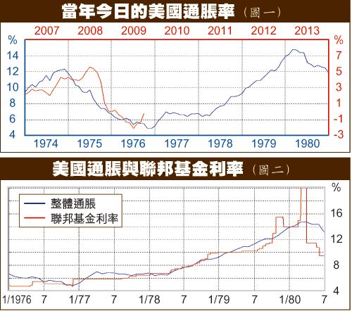 目前確有些少1976年的影子:當時美息由13厘狂減至4.75厘,結果通脹由5%升至80年的15%才見頂(圖一)。78年初以前,聯儲局由伯恩斯(ArthurF.Burns)當主席,美息一直低於通脹。同年3月由米勒(G.WilliamMiller)接任,息口只緊跟通脹,及至79年更任由通脹升溫不肯加息,結果上任不到年半便被炒掉。79年8月伏爾克接任,息口政策出現劃時代改變:由一直低於或緊貼通脹,變成高於通脹3至5%不等(圖二)。