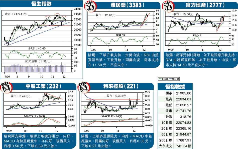 日線圖呈陰燭,在下破10日線(22074)及20日線(22365)交滙區後,進一步下挫,下破50日線(21944)支持,走勢向淡。以形態論,目前正在組成日前所預期的頭肩頂右肩,只是下調的步伐較預期為快,導致右肩的形成較為瘦長,與左肩並不對稱。