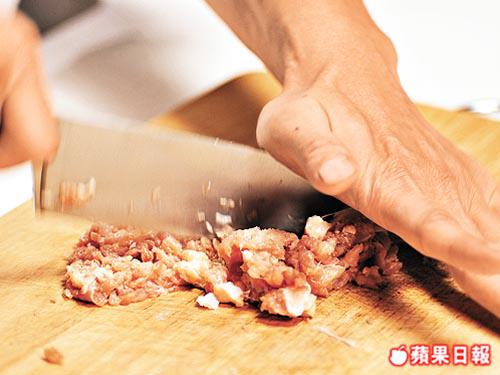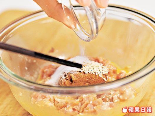 1. 雞扒去皮剁碎,加雞軟骨再剁碎後盛起,然後加蛋黃、白味噌、芝麻及鹽拌勻。