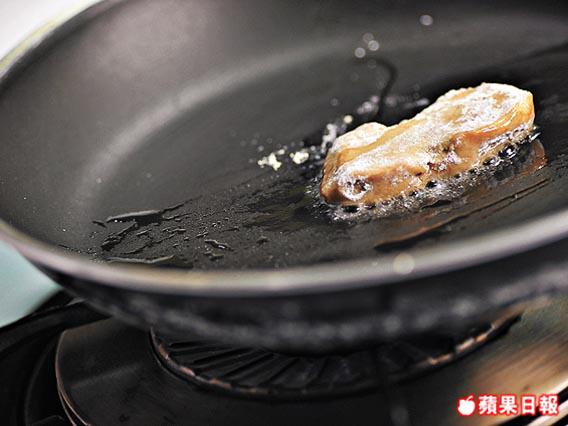 7. 起鑊下油,將鵝肝蘸上少許天婦羅粉後放入鑊,用中火煎至金黃盛起。