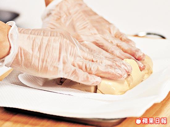 1. 將豆腐放上廚紙,用手壓碎,瀝出水份,再鋪上廚紙,放入雪櫃雪1小時,待豆腐表面完全乾透。