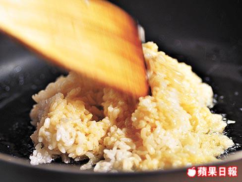 我知道炒飯要用冷飯炒才夠爽身好食,不過又未必日日有冷飯看門口,如心血來潮想即煲即炒,大廚Brian教路可先將雞蛋加入飯中拌勻,待蛋汁包住飯粒,炒起來就能更易炒開,不易黏在一起。