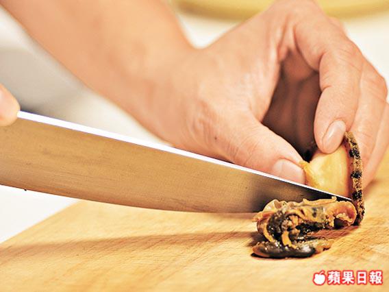 4. 將鮑魚肉離殼去內臟,鮑魚肝留用,然後一開四。