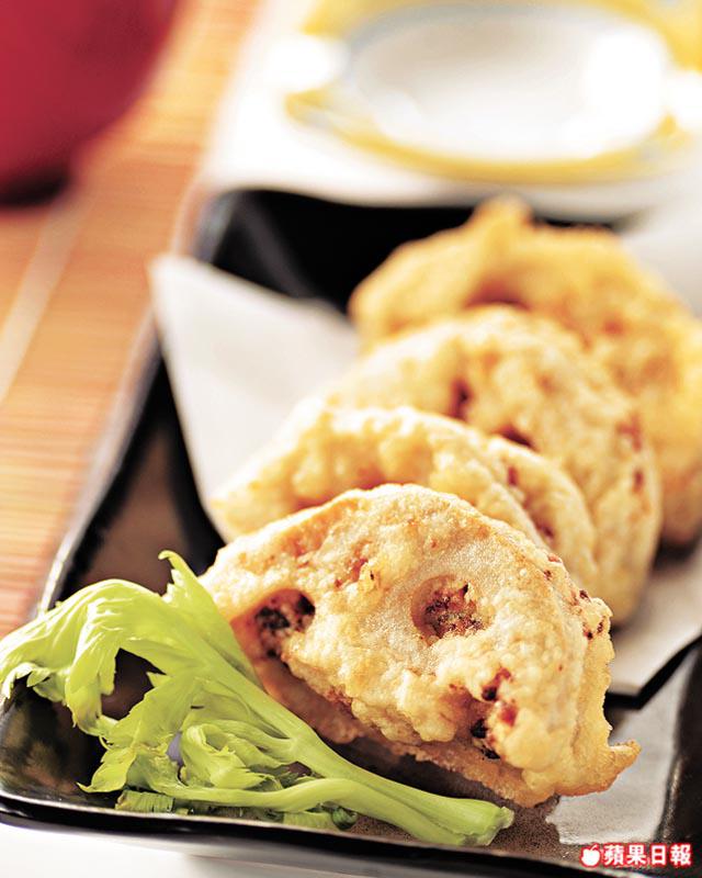 5. 將(4)蘸粉漿,放入已燒熱至180℃的油中,用細火炸3分鐘至蓮藕浮上面即可盛起,然後瀝乾油後上碟。