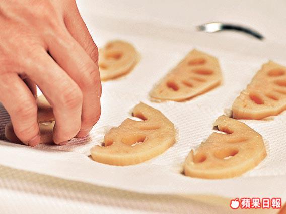 做天婦羅的蓮藕片一定要瀝乾水份,避免炸時彈油。
