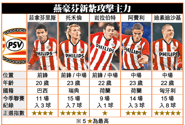 簡評:常說阿積士是荷蘭甚至歐洲球隊的兵工廠,不過,另一荷甲班霸燕豪芬,陣中亦不乏質高新星,其中中場的阿費利早在05年的世青盃已成名,至於瑞典的托禾倫亦於今夏的U21歐國盃中「響朵」。而翼鋒迪素迪沙基更早已是匈牙利國家隊的主力,巴西新晉前鋒莊拿芬里斯則是燕豪芬目前最重點培訓的年輕球員。反而上季一鳴驚人的岩拉伯特,今屆就似乎聲勢下滑,要加把勁了。