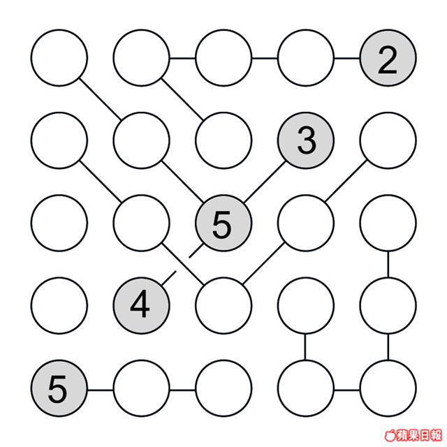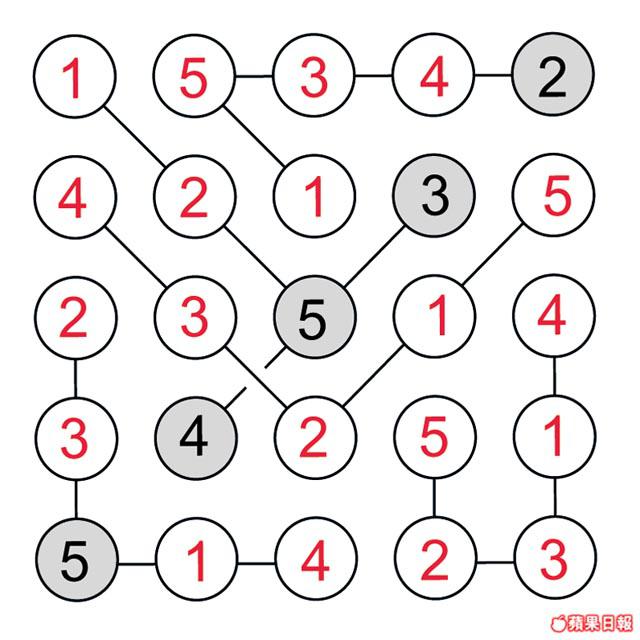 亞肥閒時愛Rap數字歌,可是部份數字還未填好在歌譜。快在空格填入數字1至5,使每直、橫行、以及同一條連線內都有齊數字1至5。