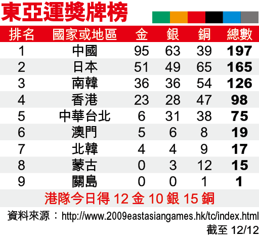 昨日東亞運單日共產生50面金牌,香港狂掃當中12金;港壁球隊盡擸餘下3金,風帆則於4項賽事中得3金。另外,在大師兄黃金寶寧棄獎牌為隊友護駕下,男子單車隊更包辦個人公路賽三甲,港隊昨日可謂憑主場之利壟斷頒獎台。記者徐嘉華、曾雁平、鄧永賢、吳淑珊直擊