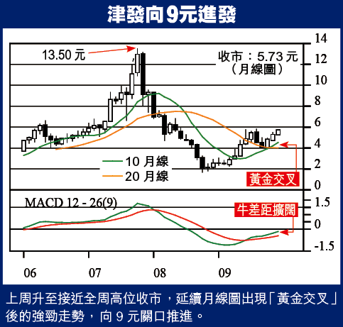 FollowMe10月25日推介津發,目標9元,由4.75元起步,上周五升至5.74元,累升20.8%,同期紅籌指數下跌3.2%,證明津發正處強勢兼跑贏大市。