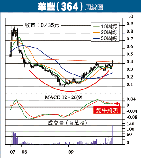華豐股價在0.4元樓下,已有成兩年時間(只有極少數日子除外),走勢形成一個有左右杯柄的大型圓底,此為典型收集形態,頸線在0.4元水平,上周五終於破位而上,並有大成交配合,中期上升大浪確認展開,目標直指0.7元。