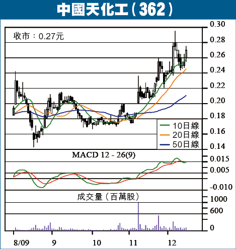 恒指昨日下跌271點,收報21813,再度失守50日線(22039)。大市雖跌,但上升正股仍有350多隻,繼續個別發展。中國天化工(362)逆流而上,收0.27元,升1.5仙,升幅5.8%,成交增至1億股。中天化工近期走勢偏強,月初升上0.295元後調整,回落到0.25元水平,昨日升勢再起,已拋離10日同20日線,MACD亦將再現「雙牛」入貨訊號,一升破0.295元,中期升浪確認,初步要到0.40元才有較大阻力。