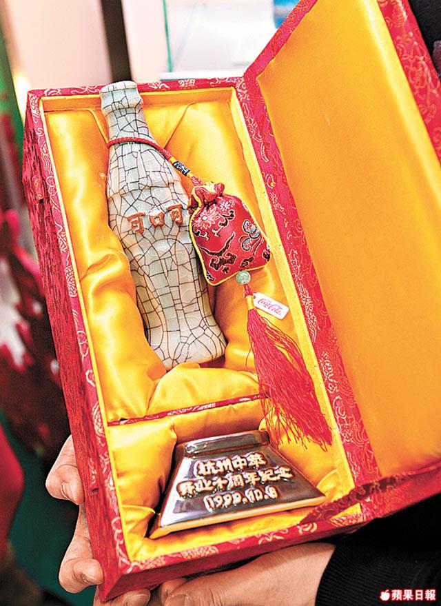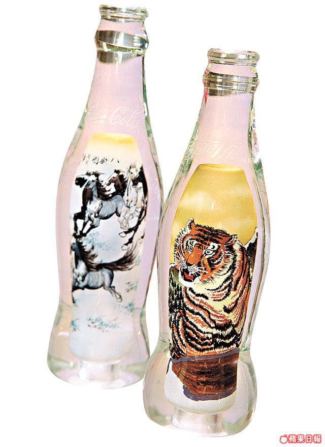 不過以上展品都未及中國作品吸引。例如來自上海的內繪可樂樽,是當地可樂廠找來當地內繪師特別製造的。內繪畫法是中國獨有的藝術手法,在古時多繪畫在鼻煙壺,今次則使用在可樂樽上,留意樽底有一小洞,勇猛的老虎,就是畫家以畫筆由此伸進樽內繪畫完成的。Hailey拿在手上拍照,也顯得相當小心:「這個樽好靚,又好貴!」Nelson:「這個內繪可樂樽每款只有約150個,十分珍貴,市價約$3,000-$4,000。」數珍藏,原來這還不是他的至愛,Nelson:「我最愛是杭州可樂廠十周年做的紀念版可樂樽,他們找來景德鎮合作,做出的這個可樂樽上面有裂紋,底部有『中國龍泉』四字,此樽更另附底座,就像景德瓷器一樣,它的製作年份是1999年,我手上有兩支,它的價值大概是$7,000。」