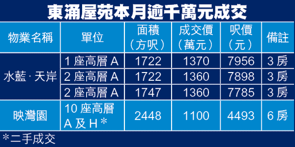 今年以來,東涌雖有逾千萬元住宅成交,惟個案不多,但本月則錄得4宗,大碼成交熾熱程度不遜於市區豪宅。除映灣園外,香港興業(480)在區內的水藍.天岸,本月低調沽出3伙,每伙逾1300萬元,消息指,其中兩伙由兩名內地投資客購入,另1伙由同區換樓客承接,呎價由7785至7956元。