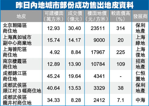 除上述兩個城市,南京國土局昨日也出售4幅商住地,有3幅都能以高底價逾倍成交。