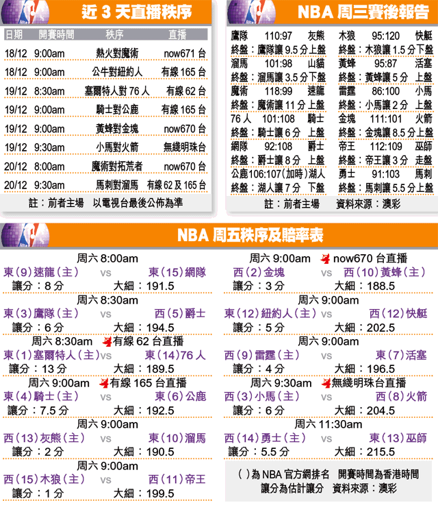 湖人獲勝後暫與塞爾特人同錄得20勝4負,並列聯盟「1哥」,湖人周六將作客網隊,繼續東岸作客之旅的第3站。