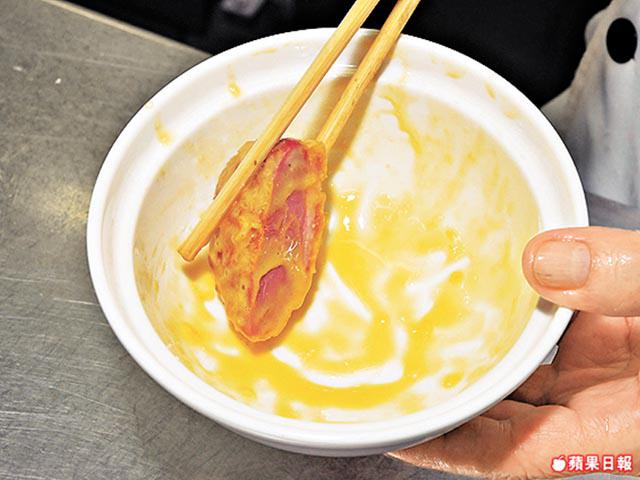 3.將鵝肝加入醃料醃10分鐘,切條,下油鑊煎至金黃色盛起。
