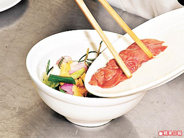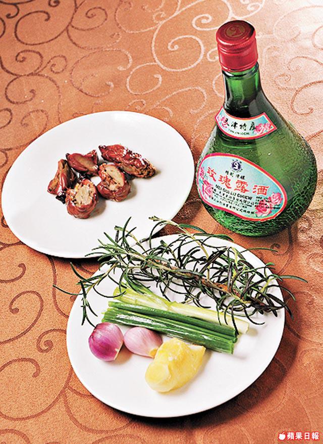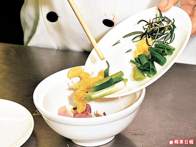 烹調本地鵝肝,首先要加玫瑰露酒、迷迭香、薑、葱及乾葱醃10分鐘,除走腥臭,也能令味道變得甘香。