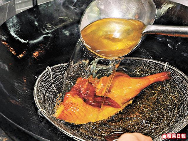3.開大火燒熱油至60℃,轉細火,將滾油不斷淋上雞身約10分鐘至雞熟,然後起出雞片。