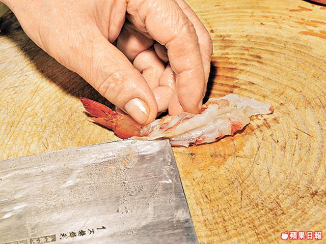 2.鮮中蝦去殼留尾,去腸,在背部略切開。