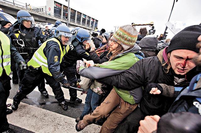 氣候會議會場外前日再爆衝突,逾3,000名環保人士企圖突破警方防線衝入會場,但被防暴警察阻止,雙方激烈推撞。警方最後用警棍追打,又發射催淚氣體和胡椒噴霧驅趕人群,有至少10人受傷,超過230人被捕。