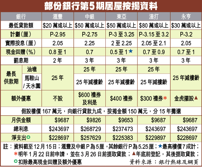 第五期居屋中籤者,本月10日開始揀樓,不少銀行趁機推出針對是次居屋貨尾的按揭優惠,條款較私樓優勝。綜合各銀行按息及優惠,東亞按息最低,實際按息僅2厘,中銀優惠最吸引,有額外600元現金回贈。 記者:黃碧珊