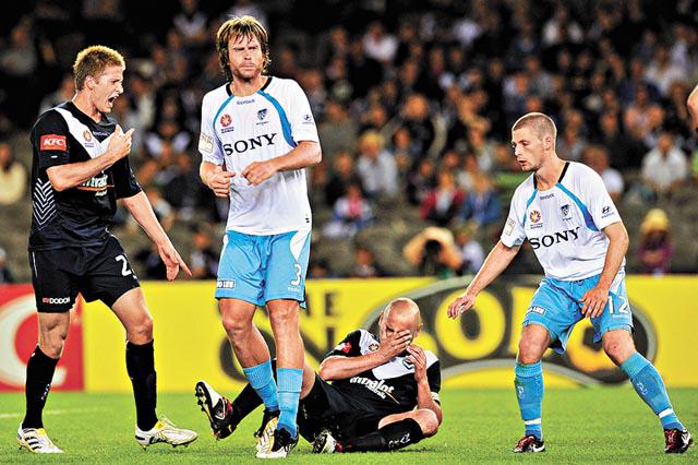 上周六的澳職榜首大戰,墨爾本勝利(藍衫)雖然佔有主場之利,但始終無法攻破FC悉尼的大門,最後兩隊互無紀錄終場,各得1分。圖為勝利中場梅斯卡特(右二)遭對手撞傷面部後倒地。GettyImages