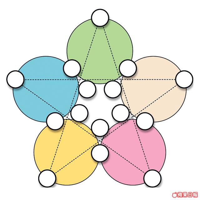 看看這個15聯星,其實每個星球都有一個號碼,而每個圓形都有五個星球包圍,剛好將包圍的五個星球號碼相加,便會等於40。另外,虛線形成的星狀,每個星角位的星球號碼相加後,同樣等於40。你們能否將1至15的星球號碼,填寫在星球上?記得以上提及的條件。