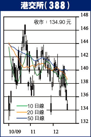 港交所現價134.90元,短線及中線處於橫行階段,長線走勢仍偏好。港交所的估值很大程度受大市成交影響,現時港股的成交量處偏低水平,長遠而言,港交所股價應有不錯的上升空間,以月供形式購入港交所亦屬合理選擇。若作長線投資,可以200元作目標。
