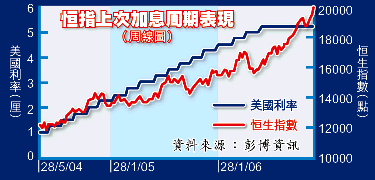 不過,並非每次加息都會為股市帶來負面影響,視乎加息的步伐,以及市場的預期。尤其是在加息初期,經濟動力通常都會較強,以2004至2006年聯儲局的加息周期為例(見圖),2004年7月開始,利率由1厘逐步加至5.25厘,期內恒指也曾出現過幾次調整。但若放眼整個時段,恒指卻由加息周期展開(2004年7月初)的12220,反覆上升至2006年底的19965,升幅達63%。