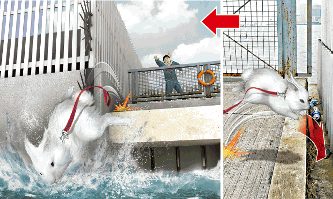 小兔連跑帶跳狂奔100米,越過圍欄及石壆,「氹」一聲直跌落大海。姊弟倆非常焦急,男童救兔心切,拿起長廊旁的水泡套在身上準備跳落冰凍海水中救兔,幸保安員趕至及時阻止。小兔在水中掙扎一會已無反應,隨水漂流。男童在岸邊乾着急,拚命呼叫:「阿旺,阿旺」,姐姐則致電報警求助。