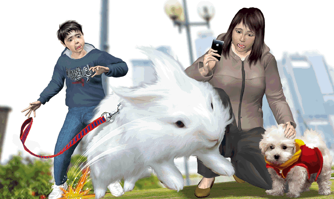昨晨8時半,姊弟把阿旺套上頸繩,用旅行袋載着帶到灣仔鴻興道狗公園散步,其間一名婦人拖着「八哥」小狗與外傭同行,她見小兔可愛於是趨前逗玩,又用手機給牠拍照。約5分鐘後,小兔疑受驚突然拔足狂奔,姊弟來不及拉住牠的頸繩,只得尾隨追趕。