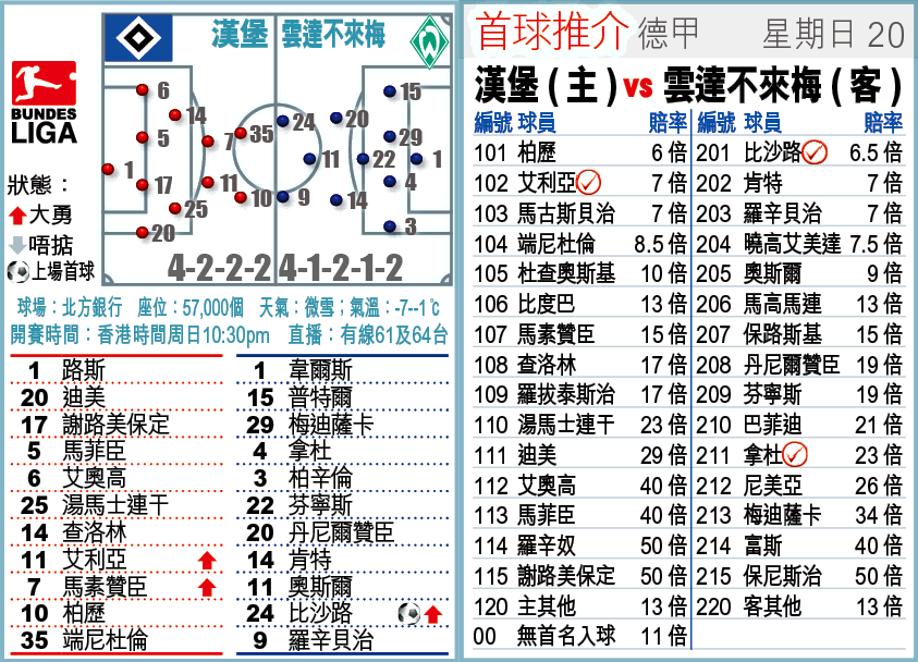 至於漢堡,今季他們有荷西古里路、柏歷、比度巴及薛羅拔圖等主力先後受傷,雖然有部份已復出,可是陣容仍不整,早前更連續7場不勝,直至上場大勝紐倫堡4:0才結束這頹勢。另外,他們近年於主場對不來梅成績差,6戰1勝2和3負,要[-1]宜取不來梅「客勝」;而「讓球」開平手,不來梅亦值得捧場。