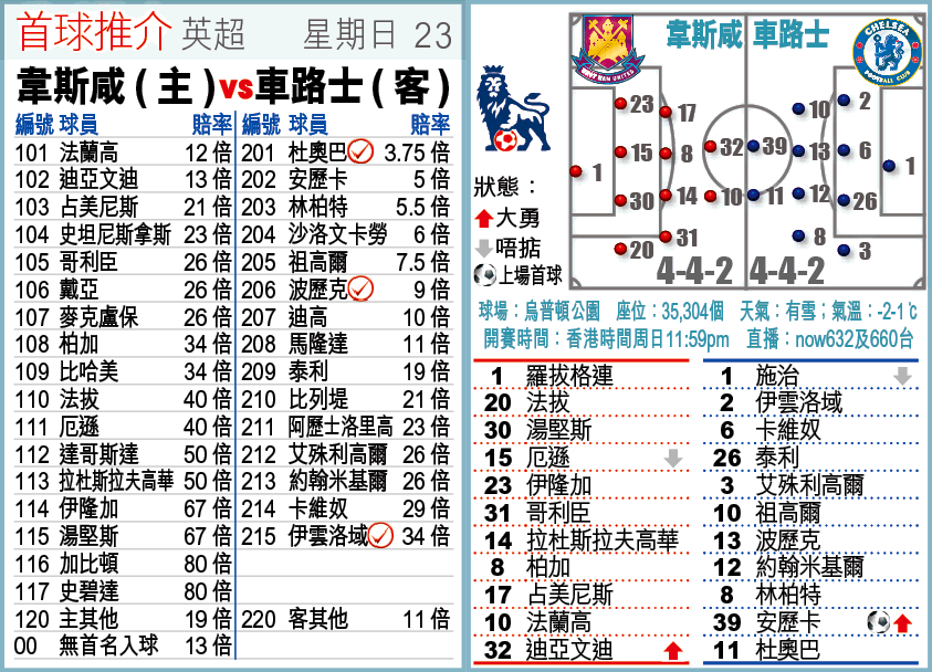 今仗雖屬倫敦打吡戰,但近年戰果甚懸殊,車路士近6次交手取得5勝1和的佳績,亦連續4季作客擊敗韋斯咸,並有狂勝4:0的大勝戰果。考慮韋咸防線易崩潰,「讓球主客和」「客勝」可捧,但因車路士門將施治近期甚多「蝦碌」鏡頭,波膽方面宜博客軍大勝兼有失球,3:1及4:1各有10倍及17倍,可敲。