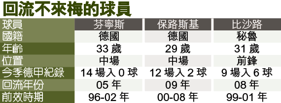 比沙路說:「我很高興可回不來梅比賽。上季我以借將身份回來效力,受到球迷熱烈歡迎,實在感動。」除比沙路外,隊長芬寧斯及中場保路斯基也是回流不來梅,而湊巧的是,他們二人都只是於拜仁比賽了一季便回不來梅繼續自己的足球事業。文:青蛙仔