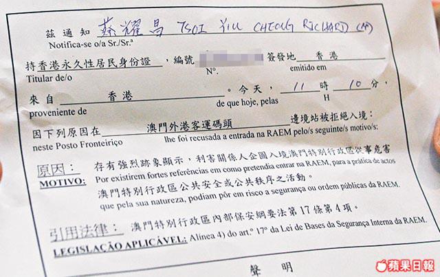 【本報訊】繼前日拒絕本港社運人士及記者入境後,澳門政府昨日再拒絕不同背景的港人入境,兩名擬到當地請願的支聯會代表、關注校園驗毒計劃的青年聯社成員,以及7名曾經前往北京請願的港商內地投資關注組代表,昨日紛紛被扣上「存有強烈跡象顯示,利害關係人企圖入境澳門特別行政區從事危害澳門特別行政區公共安全或公共秩序之活動」,拒絕入境,並且即時遣送返回香港。